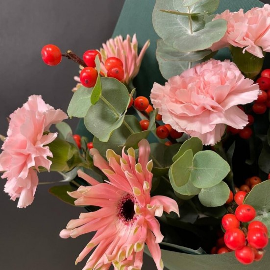 Невероятно красивый и вкуснопахнущий букет. Яркий и в то же время элегантный. Цветы стоят долго, букет свежий, поэтому долго радует глаз