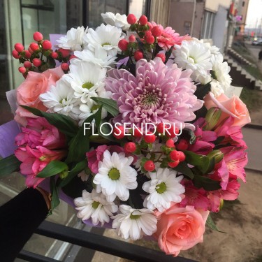 Букет из розовых роз и белых хризантем